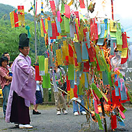 六月から御本殿に置かれた笹竹には、様々な願いが書き込まれたたくさんの短冊が結ばれております。中には、「良縁を願ったところ、結婚が決まりま した。」「やっと子宝に恵まれました。」等、嬉しい知らせが舞い込んでまいります。御縁がございましたら、是非一度御参拝になられ、五色の短冊に願いを込 められましては如何でしょうか。