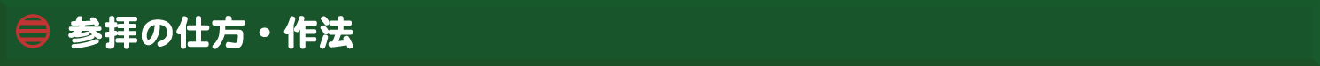 ① 軽く一礼します。(鈴のある時は一礼後に振ります) ② 二拝。(二度深く礼をする) ③ 二拍手。(両手を合わせ、右手を少し引いてから柏手を打つ) ④ 一拝。(一度深く礼をする) ⑤ 軽く一礼します。